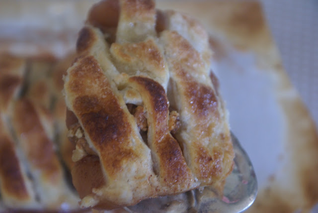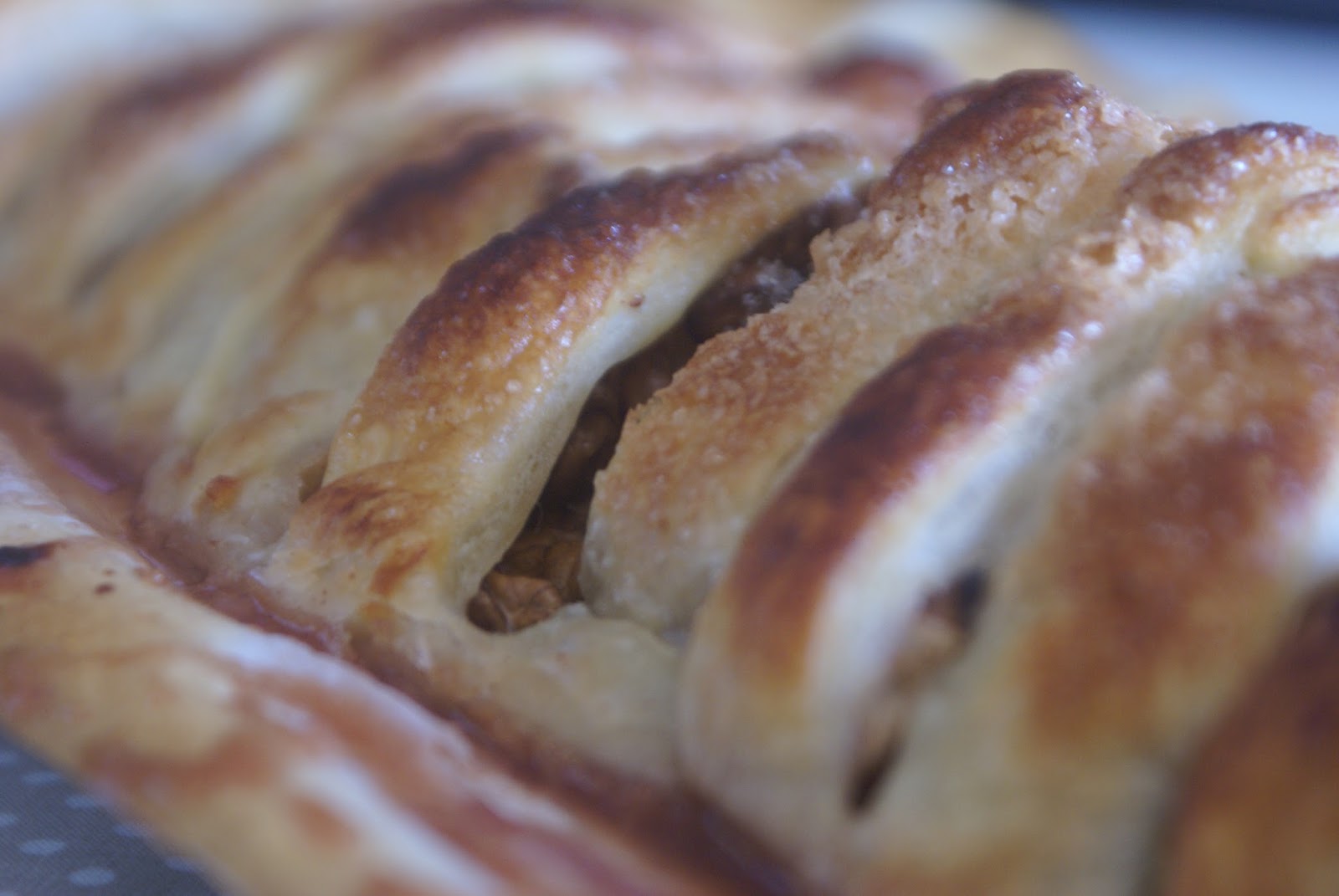 Num tacho colocar a manteiga e levar a lume brando com a maçã aos cubos e o açúcar misturado previamente numa taça com a canela cerca de 10 minutos para amolecer um pouco a maçã. Adicionar depois o vinho do Porto. Retirar do lume e deixar arrefecer. Reservar. Colocar no centro da folha de massa folhada, espalhar as nozes por cima e proceder ao entrançamento. Pincelar com eggwash e polvilhar com açúcar. Pré-aquecer o forno a 190º e deixar alourar.