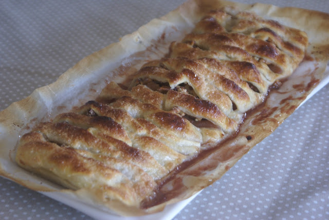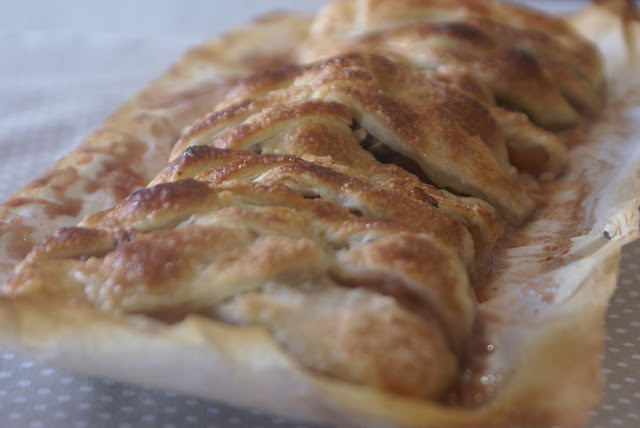 In a pan put the butter and bring to the boil with the apple to the cubes and the sugar previously mixed in a bowl with the cinnamon about 10 minutes to soften the apple a little. Then add Port wine. Remove from the heat and let cool. To reserve. Place in the center of the sheet of puff pastry, spread the nuts over the top and proceed to braiding. Brush with eggwash and sprinkle with sugar. Preheat the oven to 190º and let it brown.